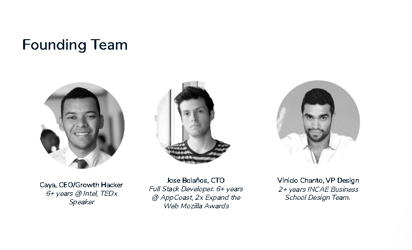 This team slide is from a presentation design startup called Slidebean, which has raised $1.6M to date. What stands out immediately is a great “Hacker, Hustler, Hipster” combo with a simple but to-the-point set of 2 - 3 bullets that speak to the major aspects of their experience that would be relevant to the startup and excite investors.