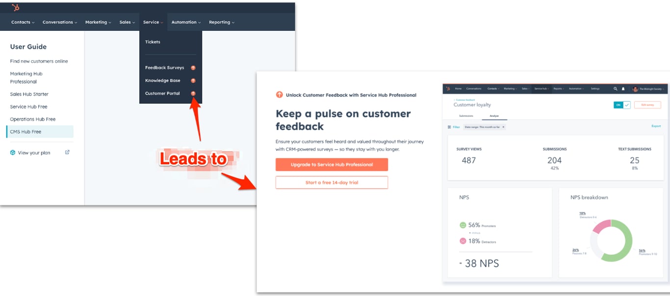 HubSpot is the master of upsells. When you sign up for a product, such as CRM, you keep coming across features that have an “↑" icon, indicating it’s a premium feature. This leads to a feature gate that prompts you to upgrade.